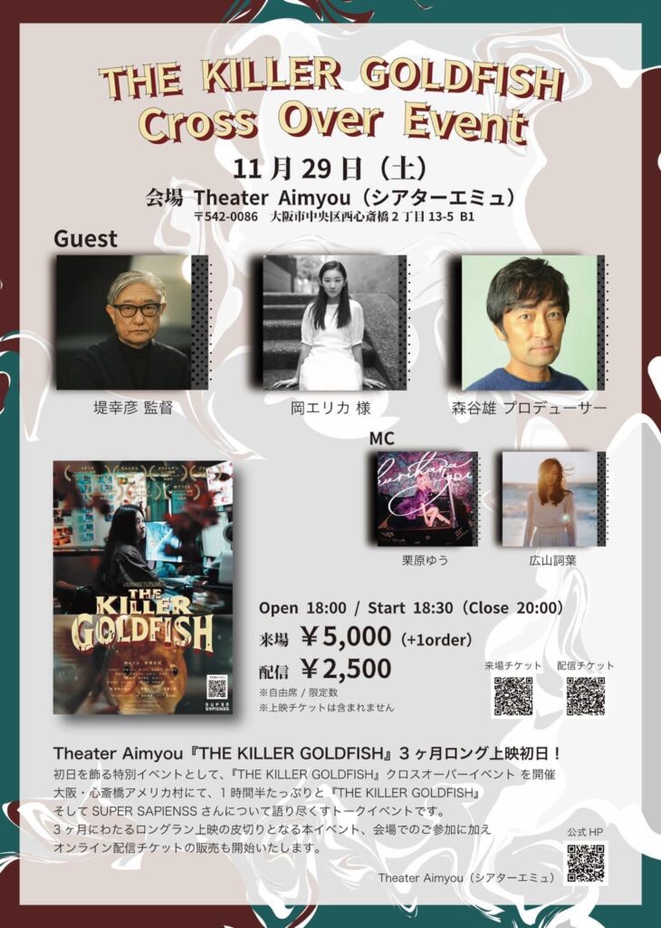 Theater Aimyou『THE KILLER GOLDFISH』3ヶ月ロング上映初日!初日を飾る特別イベントとして、『THE KILLER GOLDFISH』クロスオーバーイベント を開催。大阪・心斎橋アメリカ村にて、1時間半たっぷりと『THE KILLER GOLDFISH』、そしてSUPER SAPIENSSさんについて語り尽くすトークイベントです。3ヶ月にわたるロングラン上映の皮切りとなる本イベント、会場でのご参加に加え、オンライン配信チケットの販売も開始いたします。